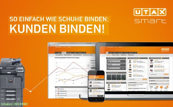 Die Lösung UTAX smart von der UTAX GmbH ist eine professionelle Managed Document Solutions (MDS) Software für den Fachhandel und mittelständische Unternehmen. smart steht für System Monitoring Analyzing Software Tool. Die UTAX smart-Box erfasst alle Verbrauchsdaten und Fehlermeldungen des Drucker- und Kopiererparks – sicher und unabhängig von Art und Hersteller. Über UTAX smart erhalten Händler und Kunden einfach per Webbrowser oder mobilem Gerät Zugriff auf alles, was für sie wichtig ist. Dies bedeutet volle Kosten- Nutzentransparenz für Unternehmen und zentrale Administration sowie laufende Optimierung der Output-Infrastruktur durch den Fachhändler. Denn mit UTAX smart erhalten Administratoren ständig tagesaktuelle Informationen über das Anwenderverhalten sowie Kosten und Nutzen der installierten Systeme. Entspricht der Einsatz aufgrund von Geschäftsentwicklung oder Mitarbeiterfluktuation nicht mehr den reellen Anforderungen und Workflows, kann die Infrastruktur binnen kurzer Zeit optimal angepasst werden.